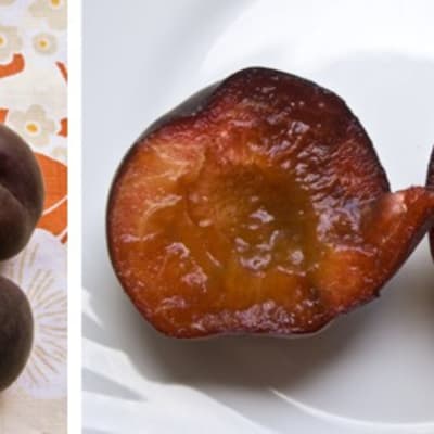 Prunus spp. Mid-late summer. Large red-purple plums with translucent yellow-orange tart flesh. Clingstone. Good fresh eating or canning. Bears reliably. Z3.
