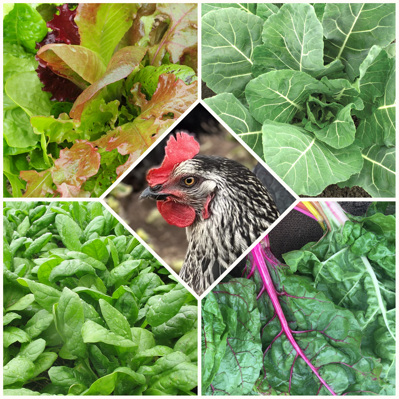 A collection of quick-growing tasty greens for chickens. Grow a patch for them to graze on, or for you to clip and feed to them—or yourself. Contains 6 A-sized packets including: lettuce mix, kale mix, collards, Swiss chard, Yokatta Na or Senposai, and spinach.
