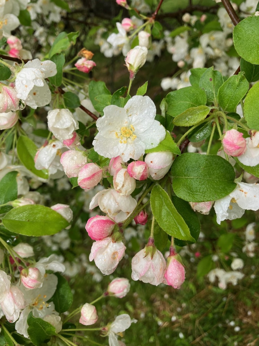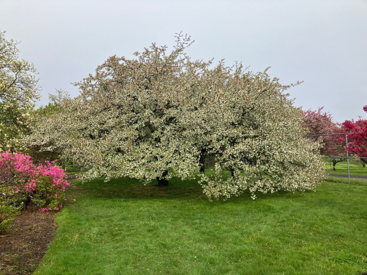 John Bunker first came across this large unlabeled, unnamed seedling at Lyle Littlefield Garden in the 1990s. The specimen was at the time more than 20' tall and 50' feet across. The beautiful bloom and the impressive convoluted form inspired him to propagate the tree. Brad Libby of the Garden agreed with John that “Lyle Littlefield” would be an appropriate name. Littlefield was a U Maine horticulture professor who started the cold-hardy trial garden in the early 1960s as a place of education and beauty for the public to enjoy. M. baccata was first introduced in North America in the 18th c. and grown for its ornamental and culinary value. Huge old trees can still be found in Maine.