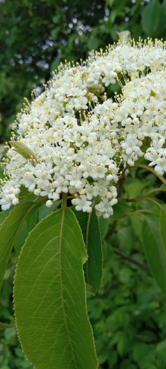 8-15' x 4-10' Vase-shaped native shrub with long straight rigid shoots that gently arch at the ends, traditionally used for making arrow shafts. Shiny deeply toothed crinkly leaves. White creamy flat flower clusters in spring turn to blue to black ¼" fruit sought after by the birds.