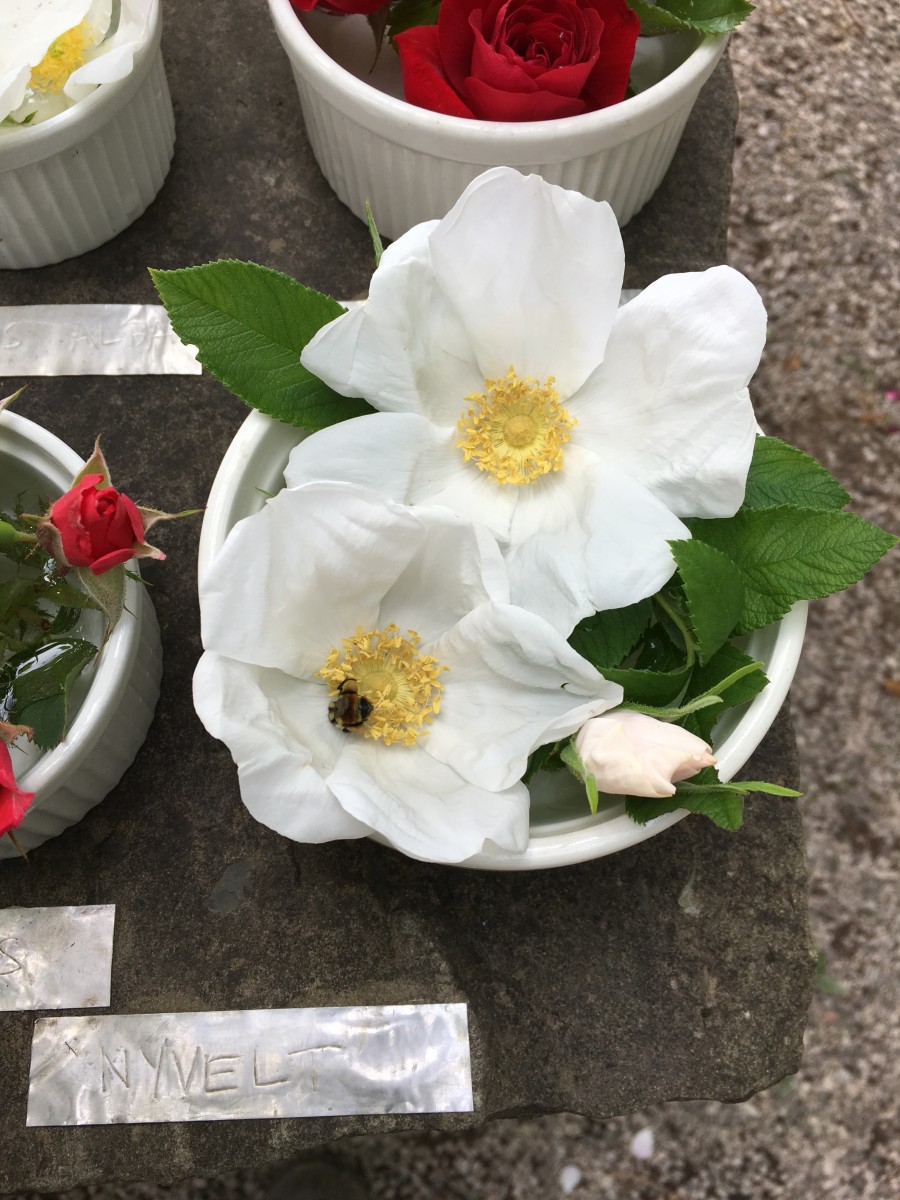 Large 4" pure white single very fragrant blooms grow in clusters and repeat all summer until the first frost. Buttery yellow centers are very accessible to pollinators. Bright green leaves and medium-sized orange-red hips for processing.